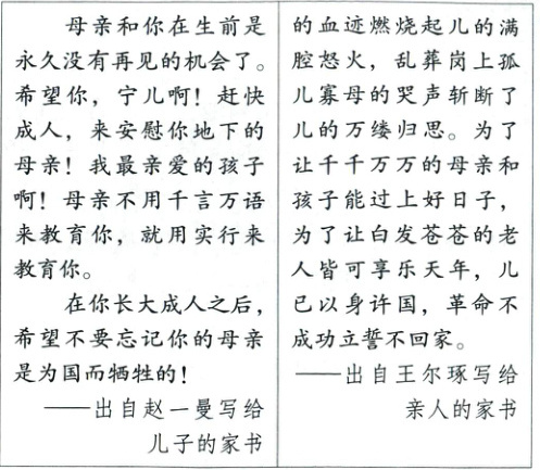 (1)[书信里的家国情怀]活动中,同学满含深情地朗读了红色家书。下面是其中两封家书的节选,请你阅读并补全后面的品读领悟。