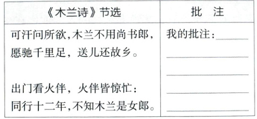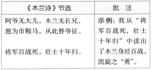 2. [2024山西一模改编]作批注是一种常用的读书方法。课文《木兰诗》塑造了巾帼英雄木兰的形象,请你参考批注示例,从下面节选的文字中任选几句,为木兰的形象作批注。