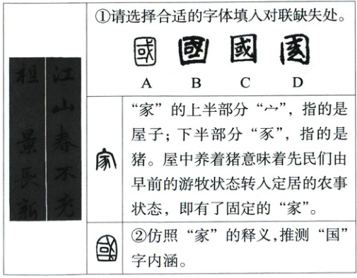 (1)① D 【解析】A.该字笔画圆转,修长美观,是篆书。B.该字形体扁平,蚕头雁尾,是隶书。C.该字形体方正,笔画平直,是楷书。D.该字笔画灵活,舒展飘逸,是行书。对联用的是行书,故选 D。②【示例】里面是“或”字,字形似“戈”(“戈”即武器),守卫“口”(“口”即城邑)。后来在字的周围加方框表示疆域,由此可知,“国”原本的意思是人在疆域上用武器守卫城邑。(2)【示例一】① ⑥【示例二】④ ②(3)【示例】小明,作为学生,我们是应该以学业为重,可学习与爱国并不矛盾,参观红色革命博物馆能够培养我们的爱国意识,增强我们的学习动力,让我们学到课本上没有的知识,这将是一次有意义的研学活动,你快加入我们吧,好吗?(4)【示例】修改病句:去掉“凭借”或者去掉“使”。爱国诗句:苟利国家生死以 岂因祸福避趋之
