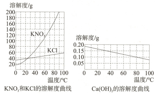 $D. $在$ 0℃$至$ 100℃$之间,不能配得溶质质量分数相等的$ KCl $和$ Ca(OH)₂$的饱和溶液