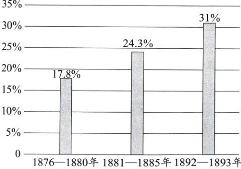 7. 下图为“1876 - 1893年日本军费开支占政府财政支出比例变化(部分)”柱状图。对图中数据变化理解正确的是( )