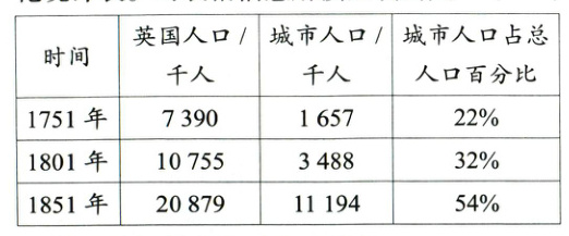 1.[历史解释]下表为1751—1851年英国人口变化统计表。对表格信息解读正确的是( )