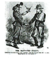 6.图示漫画于1865年10月刊登在英国的《笨拙》杂志上,主题是当年发生于美国的重大事件。画中举着酒杯的军人对对方说道:“噢,兄弟,我们没法都获胜。让我们握个手,喝点酒吧。”对该漫画的解读准确的是( )