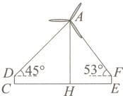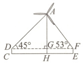 3. [2024武威]习近平总书记于2021年指出,中国将力争2030年前实现碳达峰、2060年前实现碳中和.甘肃省风能资源丰富,风力发电发展迅速.某学习小组成员查阅资料得知,在风力发电机组中,“风电塔筒”非常重要,它的高度是一个重要的设计参数.于是小组成员开展了“测量风电塔筒高度”的实践活动.如图,已知一风电塔筒AH垂直于地面,测角仪CD,EF在AH两侧,CD = EF = 1.6 m,点C与点E相距182 m(点C,H,E在同一条直线上),在D处测得筒尖顶点A的仰角为45°,在F处测得筒尖顶点A的仰角为53°.求风电塔筒AH的高度.(参考数据:sin53°≈$\frac{4}{5}$,cos53°≈$\frac{3}{5}$,tan53°≈$\frac{4}{3}$)