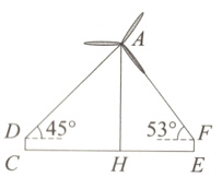 2. 中国将力争2030年前实现碳达峰、2060年前实现碳中和.甘肃省风能资源丰富,风力发电发展迅速.某学习小组成员查阅资料得知,在风力发电机组中,“风电塔筒”非常重要,它的高度是一个重要的设计参数.于是小组成员开展了“测量风电塔筒高度”的实践活动.如图,已知一风电塔筒AH垂直于地面,测角仪CD,EF在AH两侧,CD = EF = 1.6 m,点C与点E相距182 m(点C,H,E在同一条直线上),在D处测得筒尖顶点A的仰角为45°,在F处测得筒尖顶点A的仰角为53°.求风电塔筒AH的高度.
