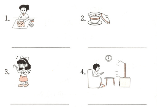 (仅供参考)1. draw a picture 2. a cup of tea 3. listen to music 4. watch TV