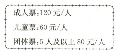 【解析】4位家长买成人票,6位小朋友买儿童票需要120×4+60×6=840(元);4位家长和6位小朋友买团体票需要80×(4+6)=800(元);4位家长和5 - 4=1(位)小朋友买团体票,剩下的6 - 1=5(位)小朋友买儿童票需要80×5+60×5=700(元)。840>800>700,所以4位家长和1位小朋友买团体票,剩下的5位小朋友买儿童票最省钱。