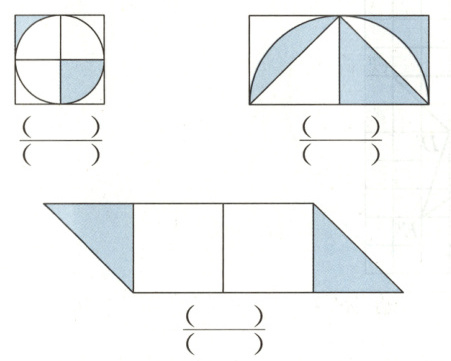 2. 下列图形中,涂色部分的面积分别占每个图形面积的几分之几?填一填。
