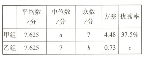 (2)答案不唯一,例如:①甲组成绩的优秀率为37.5%,高于乙组成绩的优秀率25%,所以从优秀率的角度看,甲组成绩比乙组好;②虽然甲、乙两组成绩的平均数相等,但甲组成绩的方差为4.48,高于乙组成绩的方差0.73,所以从方差的角度看,乙组成绩更整齐;③甲组成绩的中位数为7.5分,高于乙组成绩的中位数7分,所以从中位数的角度看,甲组成绩比乙组好等. 因此不能仅从平均数的角度说明两组成绩一样好,可见,小祺的观点比较片面.