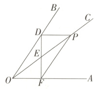 15. 推理能力 如图,已知∠AOB及∠AOB内任意一射线OC。小明在OC上取一点P,过P作PD//OA交OB于D,取OP的中点E,连接DE并延长交OA于点F,连接PF。小明说四边形ODPF是平行四边形。