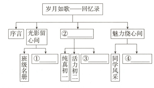 1.[2024重庆模拟]为让初中三年的青春时光不留遗憾,班级同学打算制作一本班史,下列是同学们编写班史的思路图,请根据提示,补全空缺处的内容。
