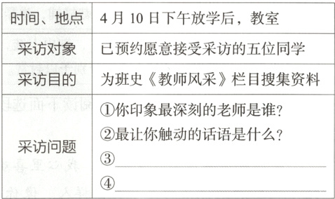 4.为撰写班史,班级文字撰写组记者拟定了采访提纲,请你根据采访目的,补充两个采访问题。