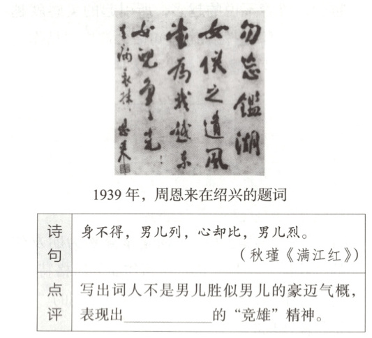 (3)[2024安阳二模] 用典是古诗词中常见的手法。“四面歌残终破楚,八年风味徒思浙”两句中,词人用“四面歌残”的典故喻指①__________,又反思八年婚姻的“风味”,家事国事交织心中,抒发了不能走出家庭投身革命的苦闷以及②__________的情感。