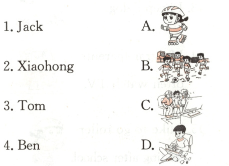 Children like to do different things on weekends. Jack likes to play football with his friends. He wants to be a football player. Xiaohong likes to go roller - skating. She is a sports lover. Tom likes to make model planes. He wants to be a pilot. Ben likes to watch TV with his family. He wants to be an actor. They all have happy weekends.
