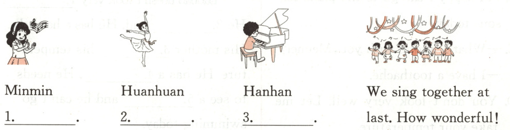 六、学校举行才艺表演,同学们纷纷展示自己的才艺。看图,写一写。