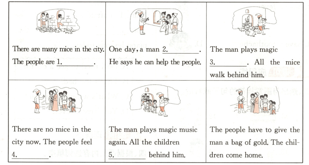 五、(北京东城区)看图片,读故事,选择恰当的单词,将其标号填写在横线上。