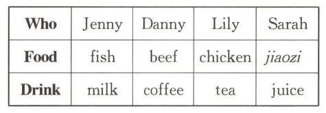 1. fish 2. coffee 3. chicken 4. juice 5. Lily