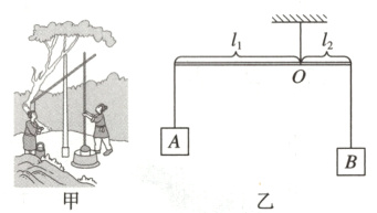 7. [2024·天津河西区模拟] 如图甲所示是《天工开物》中记载的三千多年前在井上汲水的装置——桔槔。图乙是它水平静止时的示意图,若杠杆的支点O距左端l₁ = 0.5 m,距右端l₂ = 0.2 m。杠杆左端悬挂配重物体A的重力为40 N,右端挂一水桶B,若不计杆重,求水桶B的重力。
