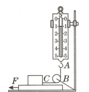 13. [新考法·装置新]小勇利用如图所示的实验装置探究影响滑动摩擦力大小的因素。在水平桌面边缘固定一个定滑轮,将弹簧测力计在竖直方向调零后如图固定。在桌面放置一块长木板,将一个长方体木块平放在长木板上,通过细线绕过定滑轮与弹簧测力计相连,并保持细线的AB段竖直、BC段水平。水平向左拉动长木板,木块相对于桌面保持静止,不计细线的重力和滑轮处的摩擦力。