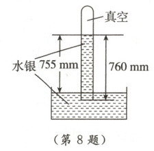 8.如图所示是小明用水银做托里拆利实验时测量的数据,则此时的大气压强相当于________mm水银柱产生的压强;若将玻璃管从竖直位置稍稍向右倾斜,则玻璃管内外水银面的高度差________(填“变大”“不变”或“变小”);如果将玻璃管上端开个小孔,玻璃管内外水银面的高度差为________mm。