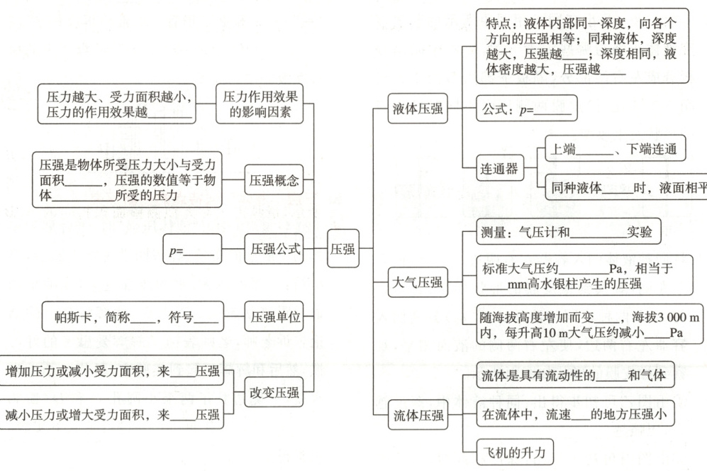 (由上到下,由左到右) 明显;之比;单位面积;$\frac{F}{S}$;帕;$Pa$;增大;减小;大;$\rho gh$;开口;静止;托里拆利;$1.0\times10^{5}$;$760$;小;$100$;液体;大