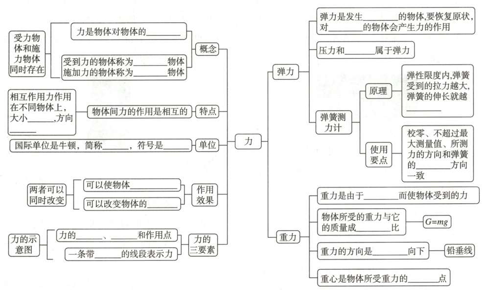 作用;受力;施力;相等;相反;牛;N;发生形变;运动状态;大小;方向;箭头;形变;与它接触;支持力;伸长;地球的吸引;正;竖直;等效作用