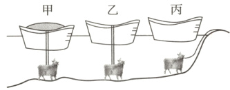 2. [2024·河南] 宋朝的怀丙利用浮船打捞铁牛,展现了我国古人的智慧。如图为打捞过程示意图,先将陷在河底的铁牛和装满泥沙的船用绳索系在一起,再把船上的泥沙铲走,铁牛就被拉起,然后把船划到岸边,解开绳索卸下铁牛,就可将铁牛拖上岸。船在图中甲、乙、丙三个位置所受浮力分别为F₍甲₎、F₍乙₎、F₍丙₎,下列判断正确的是 ( )