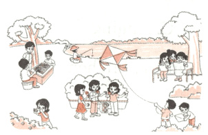 Many people are in the park. Some of them are singing. Two boys are flying a kite. Some girls are drawing pictures. A woman is taking photos for the flowers. Two men are playing chess and a man is watching them. The man with a hat is fishing near the river. They are all very happy.