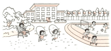 There are many children in the playground. Janet is jumping the rope with her friend. Jim and Bob are playing football. David is running a race with his friend. Look at Xiaoling. She is reading a book on the bench. They are very happy.