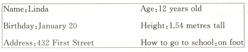 任务(一)1. 137 Weiming Street 2. 1.5 metres tall 3. June 1 4. by bus 任务(二)(仅供参考)Hello, my name is Linda. I’m a girl. I’m 12 years old. My birthday is January 20. I’m 1.54 metres tall. My address is 432 First Street. I live in a house near my school. So I go to school on foot. This is all about me.
