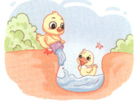 示例:早上,小鸡和小鸭去草地上找食物吃。一不小心,小鸭掉进了土坑里,爬不上来,急得直掉眼泪。怎么办呢?小鸡眼珠一转,想出一个好办法。它回家拿来一只水桶,到河边去打水,然后把水倒进土坑里。土坑里的水位渐渐升高了,小鸭得救了。小鸭高兴地对小鸡说:“谢谢你!”接着,它们高高兴兴地继续去找食物了。