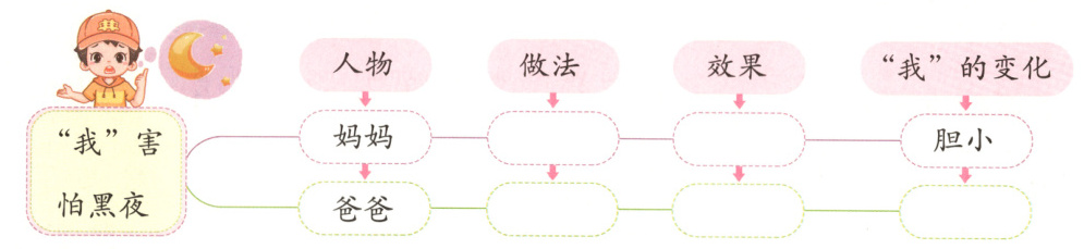 【点拨】本题考查形成解释的能力。读课文可知“我”在爸爸的帮助下克服了胆小、怕黑的弱点,变得勇敢,从而发现夜晚也像白天一样美好。所以明白的道理是“克服胆小,做个勇敢的孩子,能收获美好”。