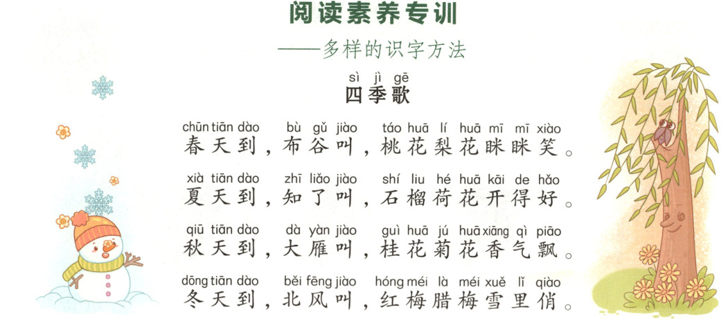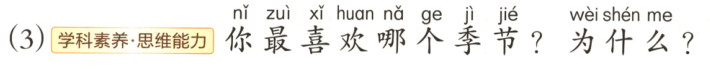 (1)左边:④右边:①③ [点拨]本题考查获取信息的能力。儿歌中提到了“春天到,布谷叫”“夏天到,知了叫” “秋天到,大雁叫” “冬天到,北风叫”,将这些信息与图片、思维导图一一对应即可完成选择。