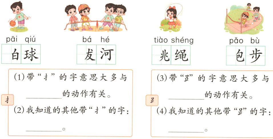 扌 扌 足 足(1)手(2)示例:打(3)脚(4)示例:踢【点拨】本题考查形声字的构字规律。观察第一、二幅图中人物的动作,结合拼音,可知填的偏旁是“扌”;观察第三、四幅图中人物的动作,结合拼音,可知填的偏旁是“足”。由此可以推测,用“扌”作偏旁的字大多与手的动作有关,用“足”作偏旁的字大多与脚的动作有关。最后各写出一个带有相应偏旁的字即可。