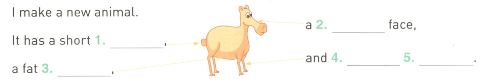 一、典典用不同动物的身体部位拼出了一个奇怪的新物种。观察图片,写单词,补全动物介绍。