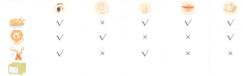 任务一:1.see [点拨]根据第一句话得知需要找“chicken, lion, smoke”都打“√”的一项,故填see。2.hear [点拨]根据第二句话得知需要找“lion”打“√”,“chicken, smoke”打“×”的一项,故填hear。3.smell [点拨]根据第三句话得知需要找“chicken, smoke”打“√”,“lion”打“×”的一项,故填smell。4.taste [点拨]根据第四句话得知需要找“chicken”打“√”,“lion, smoke”打“×”的一项,故填taste。5.touch [点拨]根据第五句话得知需要找“chicken, lion”打“√”,“smoke”打“×”的一项,故填touch。任务二:在眼睛、耳朵和手对应的表格中打“√”。