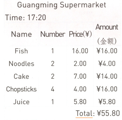 三 同学们看养老院的食物和生活用品不多了,就帮忙去超市购物。根据超市购物账单,完成下列各题。