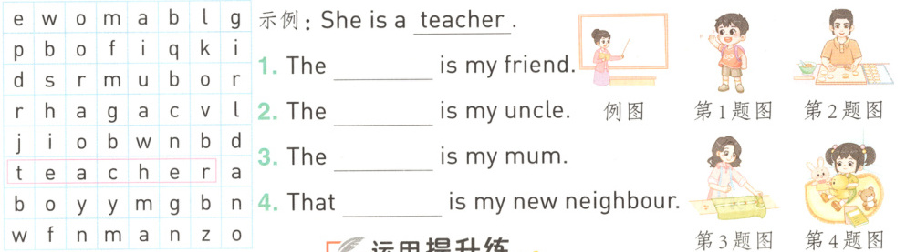 Hello, I'm Wang Hua. How are you today? Look! The 1. ________ is my friend. The 2. ________ is my new neighbour. Who's that 3. ________? He is my uncle. Who's that 4. ________? She is my mother.