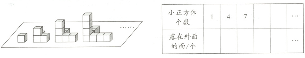 (2)堆放在一起的正方体露在外面的面的变化规律:先观察正方体的摆放特点,再从中找出正方体的个数与露在外面的面的个数间存在的规律。