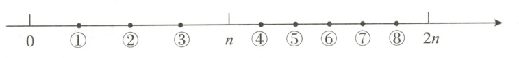 6. (新考法)下面的数线上共有8个小圆点。根据n的位置判断:$n\times\frac{3}{4}$的位置大致在( )号圆点处;$n\div\frac{3}{4}$的位置大致在( )号圆点处。