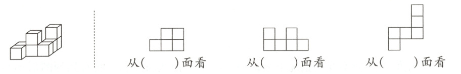 1. 下面右边的三个图形分别是从下面左边几何体的什么方向看到的? 填一填。