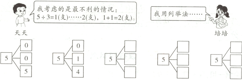 1. 把5支铅笔放进3个笔筒里,不管怎么放,总有1个笔筒里至少有2支铅笔,这是一道简单的鸽巢问题。为什么总有1个笔筒里至少有2支铅笔?请按天天的思路来说明理由,并把培培的列举法补充完整。(9分)