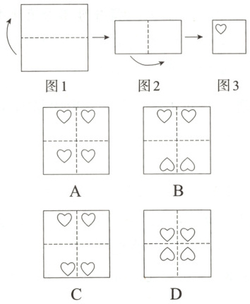 1. 将一个正方形纸片按图1、图2依次对折后,再按图3打出一个心形小孔,则将纸片展开铺平后,形成的图案是( )