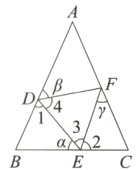 10. 如图,$△ABC$中,$AB$ $=$ $AC$,$△DEF$为等边三角形,则∠α、∠β、∠γ之间的关系为( )