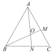 9. 如图,在等边三角形ABC中,M是AC上一点,N是BC上一点,且AM = BN,∠MBC = 25°,AN与BM交于点O,则∠MON的度数为( )