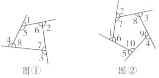 如图②,∠1 = 180° - ∠6,∠2 = 180° - ∠7,∠3 = 180° - ∠8,∠4 = 180° - ∠9,∠5 = 180° - ∠10,∠6 + ∠7 + ∠8 + ∠9 + ∠10 = 180°×(5 - 2) = 540°,五边形外角和:∠1 + ∠2 + ∠3 + ∠4 + ∠5 = 180° - ∠6 + 180° - ∠7 + 180° - ∠8 + 180° - ∠9 + 180° - ∠10 = 180°×5 - (∠6 + ∠7 + ∠8 + ∠9 + ∠10) = 900° - 540° = 360°。