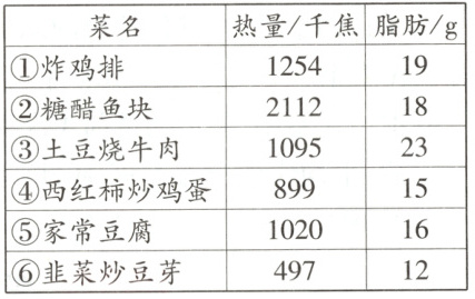 3.(教材P97例题变式)10岁儿童的营养午餐标准是:从每顿午餐中获取的热量应不低于2926千焦,脂肪应不超过50g。某学校食堂某天菜谱所含热量、脂肪含量如右表:请你从菜谱中选择三种不同的菜肴,搭配一份符合标准的营养午餐。我的选择是( )、( )和( )。(填序号)(6分)