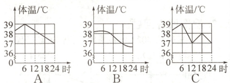 $2. $早晨,亮亮发烧得厉害,吃药后感觉到好多了,中午时,亮亮的体温基本正常,但到下午他的体温又开始上升,直到半夜,亮亮才感到身上不那么发烫了。下面的折线统计图能基本反映出亮亮这一天$(0~24$时$)$体温变化情况的是$( )。$