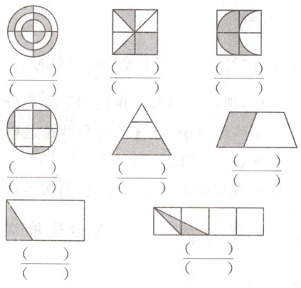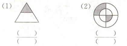 分析与解答 图(1)看起来不能用分数表示,我们可以通过添加辅助线将图形分成4等份(如下图),从而写出正确的分数;图(2)中把整个大圆看作单位“1”,看起来没有平均分,但是我们可以通过移动小块涂色部分的位置,将两个阴影部分合并,原图转化成平均分成4份(如下图),从而写出正确的分数。