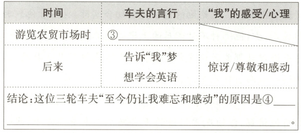 18. 请阅读全文,根据提示补充表格,探究这位三轮车夫“至今仍让我难忘和感动”的原因。(2分)